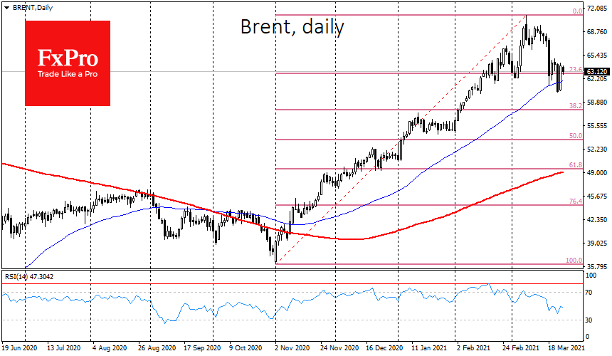 Заблокировавший Суэцкий канал танкер оказал такую нужную поддержку для нефти, остановив распродажу, которая набирала обороты. Благодаря инциденту с танкером цена получила поддержку на спаде к 60 за баррель Brent.