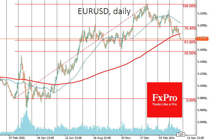 Единая валюта сейчас в большей степени ведет себя как тихая гавань, отступая на росте рынка. В результате, индекс доллара забрался выше 200-дневной средней.