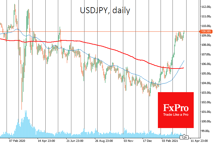 На валютном рынке наибольшее снижение в парах с долларом испытывают тихие гавани: швейцарский франк и японская иена. USDJPY вернулась в область девятимесячных максимумов выше 109.2 после непродолжительного снижения в направлении 108. USDCHF превысила уровень 0.94 впервые с июля прошлого года, также отражая возвращение спроса на рисковые активы.