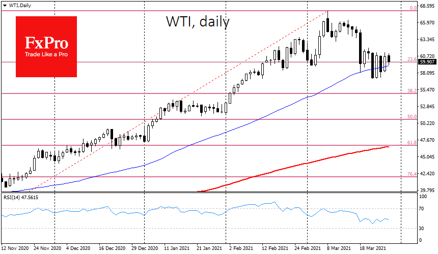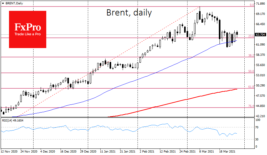Теперь нефть оказалась прибита к 50-дневной скользящей средней в ожидании заседания консультативного совета ОПЕК+ первого апреля, где будет обсуждаться судьба квот на май.