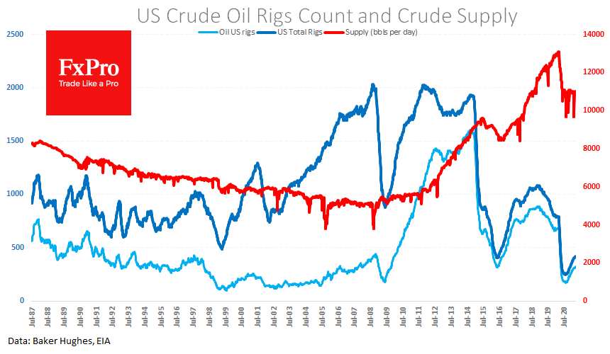 Новые данные из США отмечают новый рост числа нефтедобывающих буровых на прошлой неделе до максимумов с мая. Другой отчет ранее показал, что добыча вернулась к уровню 11 млн баррелей в сутки, где с небольшими исключениями находится с июня прошлого года.
