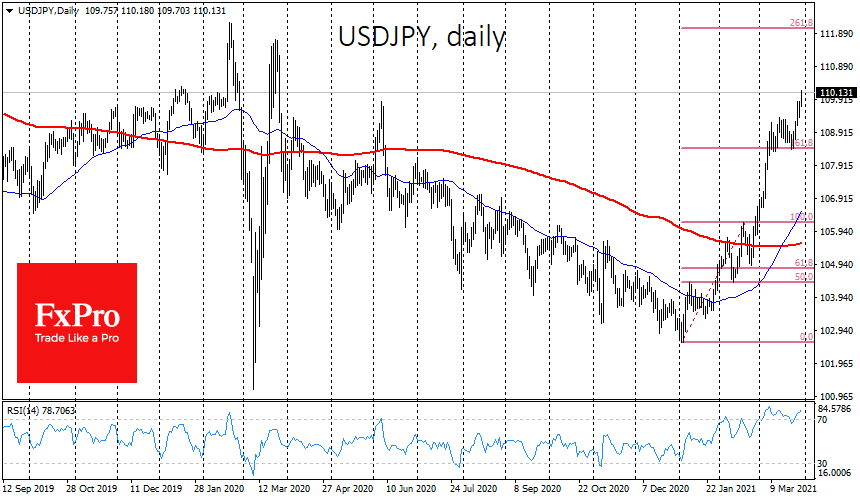 USDJPY взяла 110 ранее утром и в целом демонстрирует весьма агрессивный рост, почти весь март находясь в области перекупленности. Формально, иена оказалась на территории разреженного воздуха, не имея значимых отметок, за которые можно зацепиться, вплоть до области 111.7–112. Однако будет крайне удивительно, если весь этот рост пара сможет проделать без заметных коррекций.
