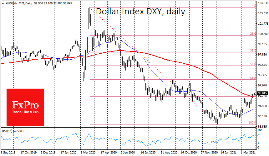 Так, Индекс доллара забрался выше 93.00, превысив 200-дневную среднюю и постепенно набирая силы в этой области. Без значимых технических препятствий восхождение индекса способно продолжиться вплоть до 93.6–94.0, где проходит уровень 61.8% от снижения мая — января и разворотная точка начала ноября. Более отдаленной целью выглядит уровень 94.7, на 61.8% от торгового диапазона последнего года.