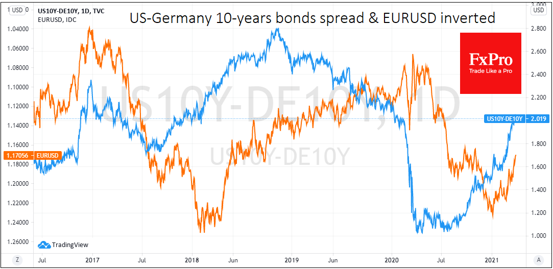 Стоит отметить, что растущий спред доходностей гособлигаций США и Германии, как и в случае с Японией, наблюдался на рынках с июля. Однако заметное влияние на курс валютной пары он стал оказывать только с начала этого года, отбросив EURUSD с 1.2330 в начале января до 1.1700 сейчас (-5%).