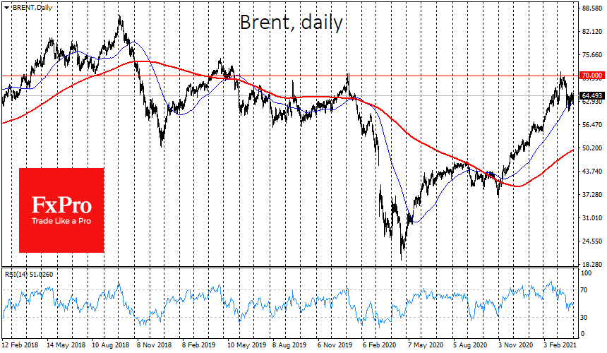 Brent в очередной раз нашла поддержку на спаде к 50-дневной скользящей средней и прибавила более 3% к закрытию в четверг. Дальнейшее улучшение макроэкономических перспектив может и далее толкать цену вверх и имеет потенциал в апреле вернуть Brent выше $70. Однако далее трейдерам нужно будет обращать больше внимания на динамику добычи в США, которая может резко вырасти благодаря бурному росту цен.