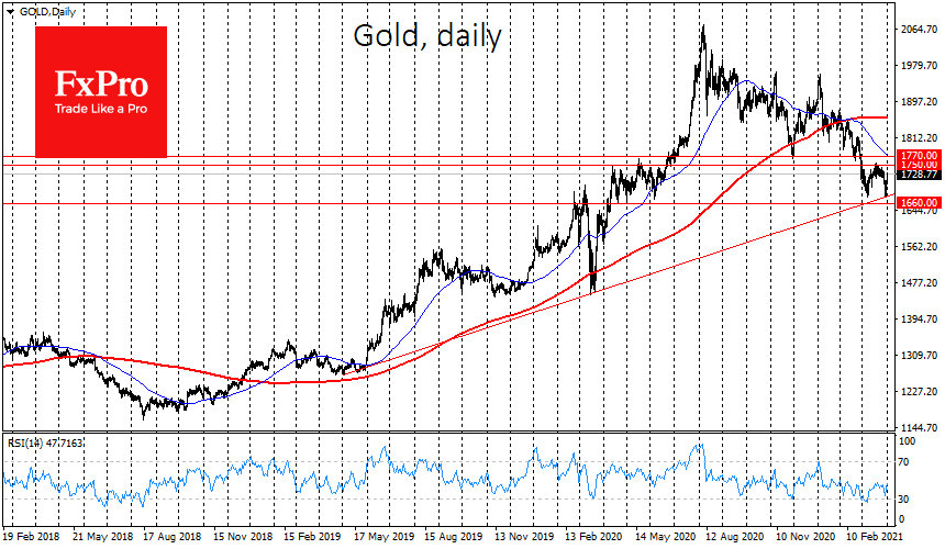 Дополнительно зацементирует коррекцию золота и скачок над уровнем $1770, через который проходит 50-дневная средняя и находится область минимумов провала декабря.