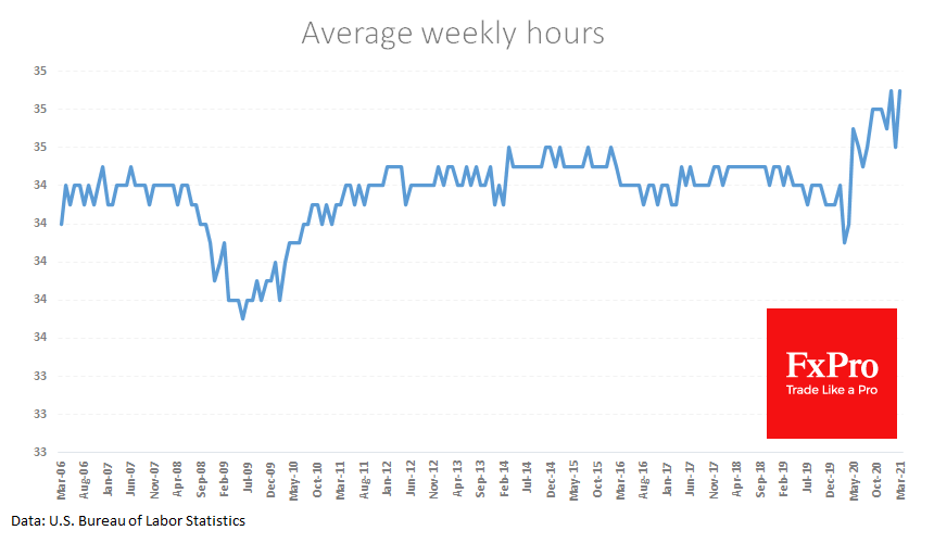 Дополнительный позитивный сигнал с рынка труда – рост средней продолжительности рабочей недели до 34.9 часа, повторение максимумов января и самые высокие значения в истории показателя с 2006 года. Эти данные отражают высокую загрузку людей, предполагая и далее здоровые темпы роста занятости.
