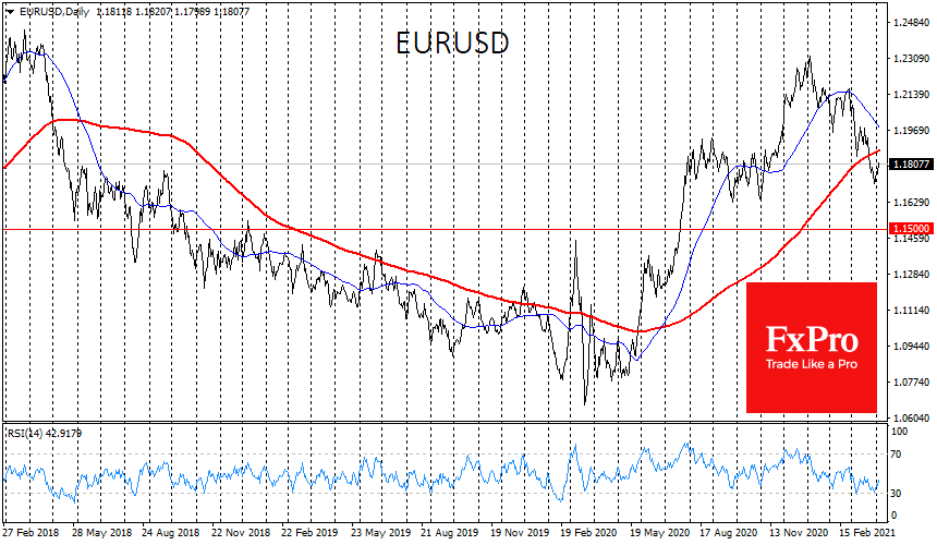 Доллар также отступает с начала месяца, отступая в том числе и к единой валюте. Спрос на риски часто коррелирует с ослаблением доллара, поэтому такое состояние кажется нам более устойчивым, чем одновременный рост акций и USD.