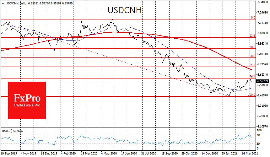 Показательной также выглядит динамика USDCNH. Пара откатилась вверх на 23.6% от большого снижения с 7.20 до 6.40. Скорректировав свою перепроданность, пара теперь не имеет технических преград перед новой волной снижения.