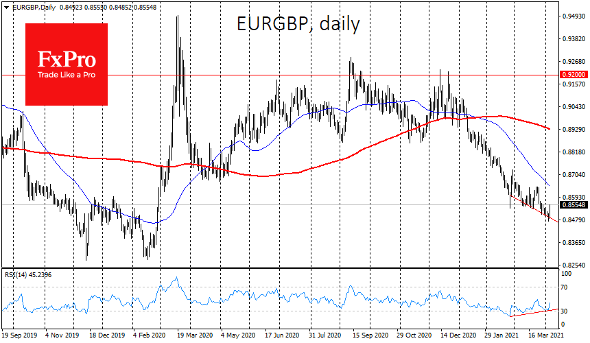 Фунт рос с начала года на сравнительно успешной кампании вакцинации в стране, на резком контрасте с еврозоной. Однако нельзя исключать, что мы сейчас видим перелом тенденции, которая выделяла фунт среди крупнейших конкурентов.
