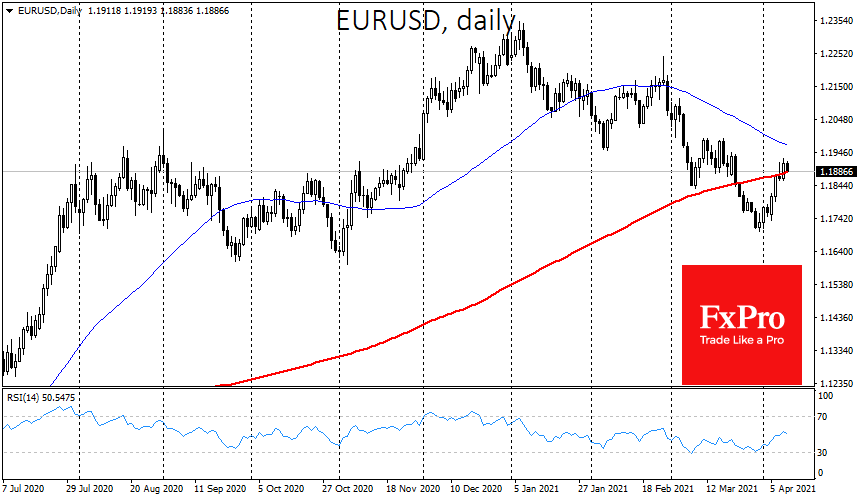 Восстановление EURUSD также стоит рассматривать как сигнал к повышению спроса на защитные активы. Европейский Центробанк нарастил баланс, усилив тем самым краткосрочное давление на евро. Однако покупатели единой валюты оказались сильней печатного станка, уведя EURUSD выше 200-дневной средней и отметки 1.1900. Здесь мы уходящей неделе видели наиболее резкий прирост с конца прошлого года.