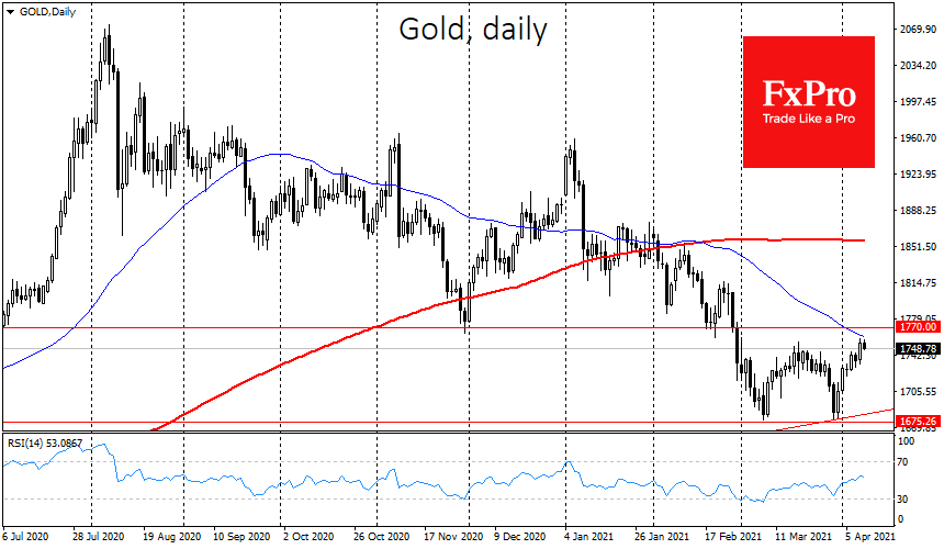 Интересно, что золото в этих условиях наслаждается интересом покупателей, восстановившись в какой-то момент до $1755 – максимумов с начала марта. Сейчас цена отступила до $1750, натолкнувшись на сопротивление в виде 50-дневной скользящей средней.