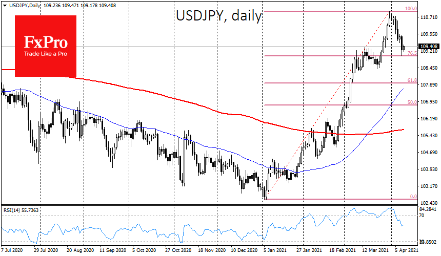 Японская иена активно теряла позиции с января, а на этой неделе, напротив, прибавляет в паре с долларом. За восемь дней апреля курс USDJPY прошел путь от области 111 до 109. Пока еще слишком рано говорить, что мы стоим на пороге еще большей распродажи, поскольку наблюдаемый откат остаётся в рамках коррекции предыдущего ралли. Развитие спада под 109 способно распространить волну фиксации прибыли на другие рынки и валюты.