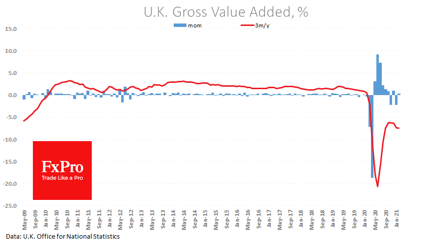 Сектор услуг пока заметно тормозит экономику, прибавив в феврале лишь 0.2%. Планируемое смягчение ограничений уже в ближайшие недели должно сделать теперь сферу услуг не тормозом, а помощником восстановления.