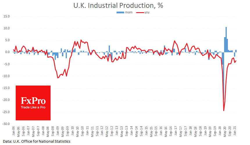 Преимущественно позитивные макроэкономические данные за февраль по Британии поддерживают восстановление британского фунта утром во вторник. ONS сообщила, что экономика прибавила 0.4% после сокращения на 2.2% в январе. Промышленное производство прибавило 1%, вдвое сильней ожиданий.