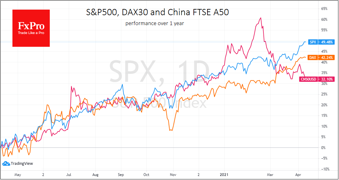 Хороший пример – Китай. Индекс голубых фишек шанхайской биржи China A50 с конца марта курсирует в области минимальных значений с декабря. Германия, на контрасте, страдает от третьей волны коронавируса и сопутствующих ограничений, в то время как DAX проторговывает исторические максимумы.
