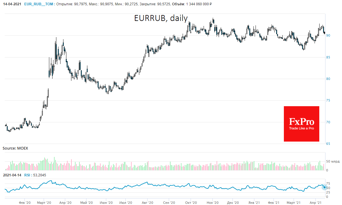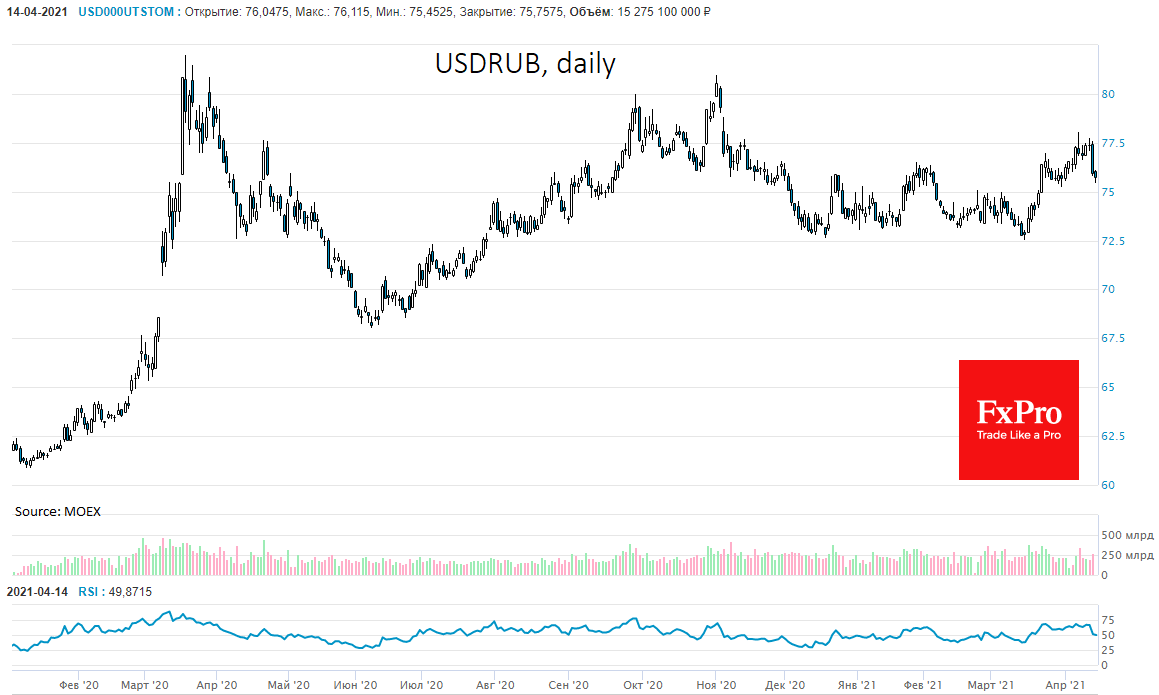 Более того, позитивный глобальный фон на мировых рынках способен дополнительно питать укрепление курса. В этих условиях USDRUB уже до конца недели способна уйти в область ниже 75 по направлению к 72-73 на конец месяца. EURRUB по силам нырнуть под 90 уже сегодня и к маю достичь 88.