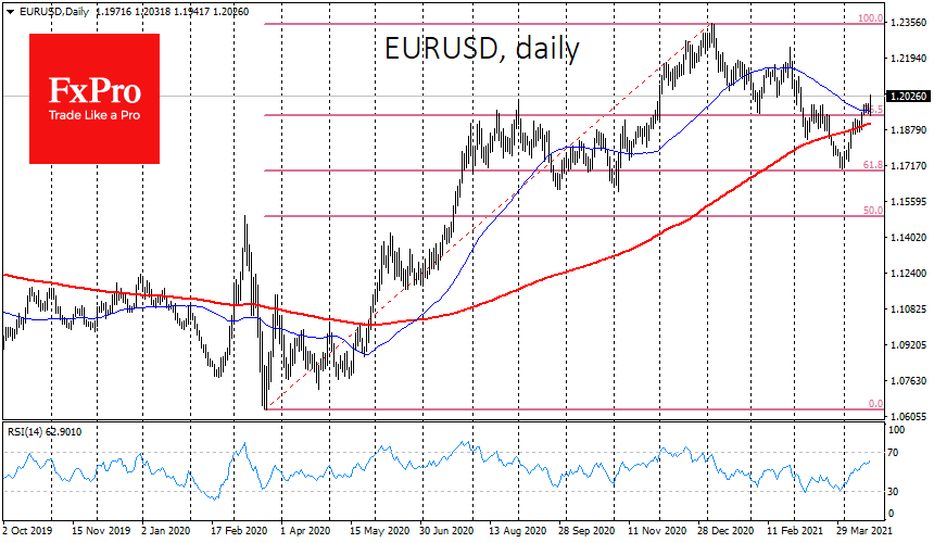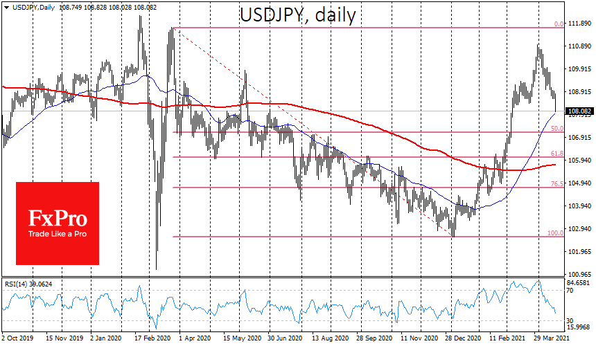 Вполне вероятно, что с началом апреля мы видим и старт нового импульса на ослабление доллара. Его сила сопоставима с тем, что происходило с мая по декабрь 2020 года. В рамках нынешнего импульса EURUSD может нацелиться на 1.33, в то время как GBPUSD может и вовсе уйти на 1.55. USDJPY в этих условиях будет грести против течения, поэтому по этой паре не стоит ждать обновления минимумов, а лишь откат в область 102–105.