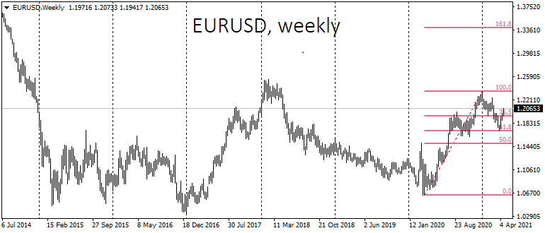 Подобный подход краткосрочных спекулянтов предполагает, что рост евро с начала апреля на самом деле лишь коррекция от снижения января-марта. Однако если посмотреть на ситуацию шире, нам откроется обратная картинка: как раз снижение EURUSD с января по март - не более чем коррекционный откат после импульса роста с марта по декабрь 2020 (по первые числа января, если быть точным). Это классическая коррекция по Фибоначчи на 38.2% от ралли с минимумов марта 2020 по максимумы января 2021.
