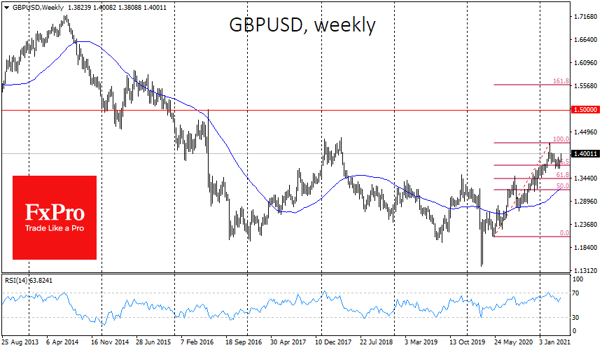 Сумев удержать 1.4000, GBPUSD может очень быстро направиться к февральским максимумам выше 1.4240, что также вблизи пиковых значений 2018 года. Далее уже открывается быстрая и прямая дорога на 1.5000: это одновременно и важный круглый уровень, и максимум за все время после Brexit-референдума.