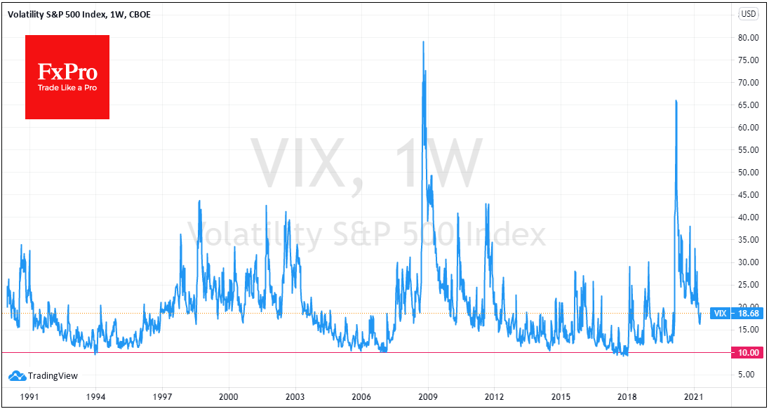 VIX, так называемый индекс страха, в прошлую пятницу опустился до 16.25, минимумов за 14 месяцев. Часто экстремально низкие его значения рассматриваются как признак излишней самоуспокоенности рынков, предвещая распродажу. Однако в современной истории поворотной точкой был уровень 10, что заметно ниже недавних минимумов. Вполне вероятно, что нынешний всплеск окажется непродолжительным и еще имеет пространство для снижения.