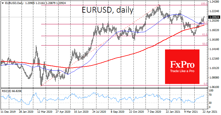 Пара EURUSD превысила отметку 1.21, утвердив победу быков вблизи порогового значения 1.20. Здесь картина очень похожа на динамику индекса доллара, в котором евро имеет наибольший вес.