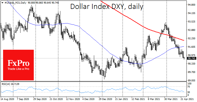 Индекс доллара опустился к уровням начала марта, под 91. Трендовые линии 50- и 200-дневной скользящих средних оказались над ценой, подтверждая нисходящий тренд.