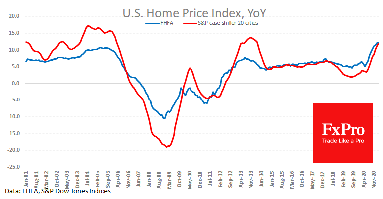Цены на недвижимость в США развивают свое ускорение. Индекс цен FHFA (федерального агентства жилищного финансирования) в феврале обновил рекордный темп роста к тому же месяцу годом ранее, поднявшись на 12.3%.