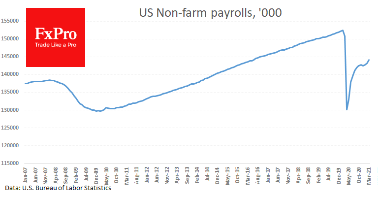 Часть спроса, а, значит, и рабочих мест, может оказаться утерянной на многие годы. В марте рынок труда прибавил 916 тыс. новых мест. Это на 8.4 млн ниже, чем в феврале 2020 и на 11 млн. меньше, чем могло быть, если бы рынок труда сохранил темп роста, который был до пандемии.