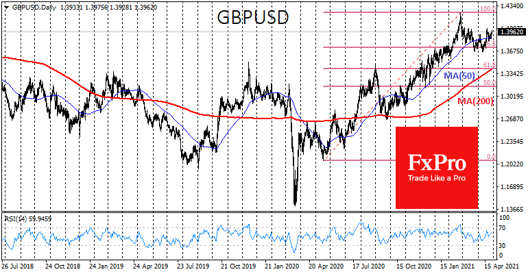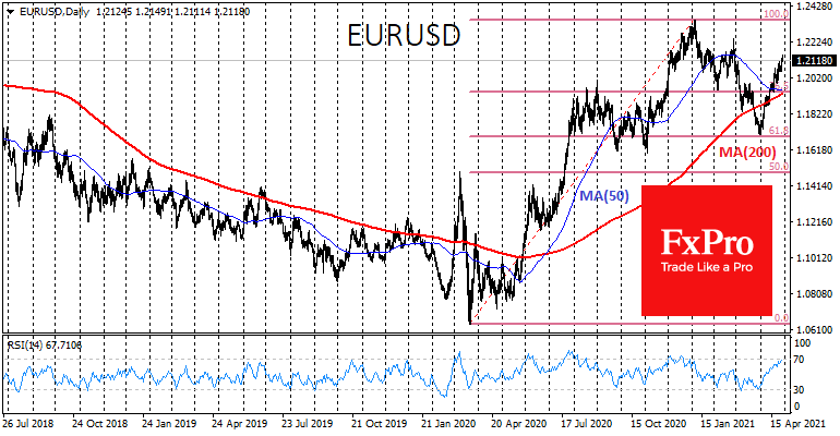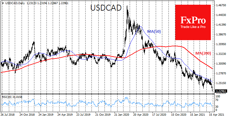Доллар США на этих заявлениях вернулся к умеренному ослаблению. EURUSD вновь оказалась выше 1.21, достигнув максимумов с конца февраля. GBPUSD вновь флиртует с уровнем 1.4000, значимой круглой отметкой. USDCAD рухнул до 1.2300, минимального значения с января 2018 года.