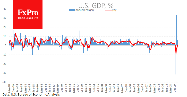 Вместе с последним ростом ВВП оказался на 0.4% выше уровня годом ранее, то есть коронавирусный спад преодолен. В то же время ни ФРС, ни администрация президента США не спешат отходить от политики усиленного стимулирования.
