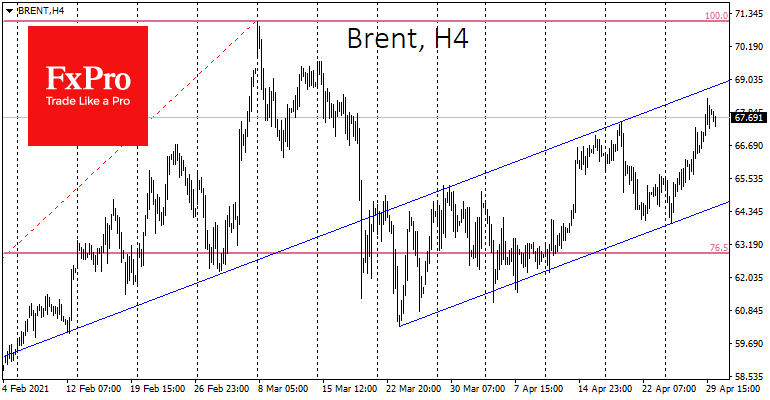 Ранее в апреле попытки нефти оторваться от линии поддержки восходящей тенденции были остановлены на уровне $67.50, откуда в марте началась сильная распродажа. Постепенно набирая силу, котировки сейчас вновь оказались у этого уровня, повторно пытаясь оторваться от указанной скользящей средней.