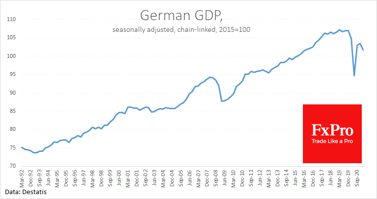 Германия, как еврозона в целом, пострадала от восстановления локдауна, связанного с третьей волной распространения коронавируса и проблемами с массовой вакцинацией.