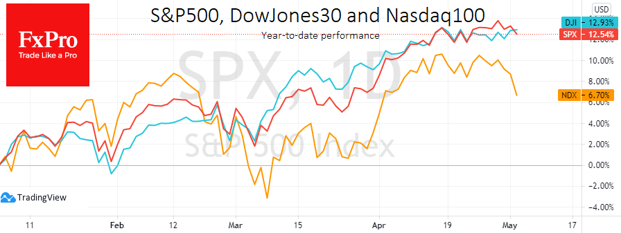 В теории активное повышение ставок наносит более существенный удар по акциям компаний роста, которые и без того в последние дни подвергались повышенному давлению. Значительная часть повышения их котировок в последний год обеспечивалась уверенностью, что экстремально низкие ставки позволят годами поддерживать опережающий рост высокотехнологичных компаний, которые стремятся расширять свой бизнес, используя политику «легких денег».