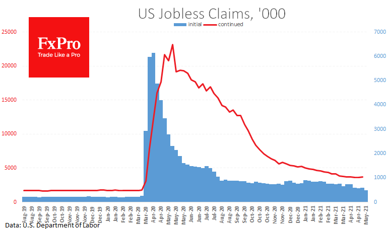 Новый признак силы рынка труда в США с падением недельных обращений за пособиями 498 тыс. – самое низкое значение с марта 2020. Падение этого показателя заметно ускорилось в апреле, и это еще одна причина, чтобы рынки настраивались завтра на сильный отчёт по занятости за месяц.