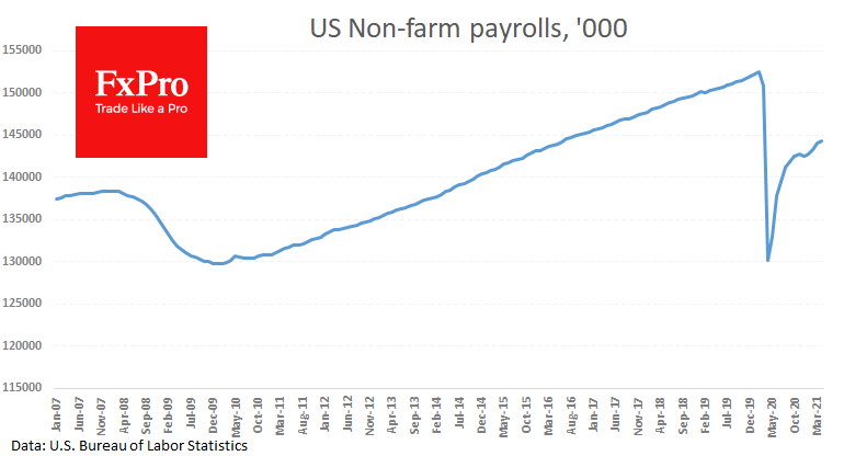 Первоначальная реакция рынка была канонической: доллар упал на оживлении спекуляций, что ФРС еще не скоро повернётся к ужесточению политики. Nasdaq выстрелил вверх из-за снижения доходности облигаций. В то время как слабость доллара и после отчета объяснима, реакция «чем хуже, тем лучше» рискует оказаться не такой уж устойчивой.