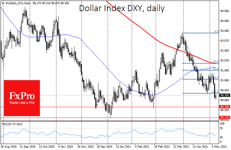 Реагируя на изменение ожиданий в монетарной политике, индекс доллара потерял 0.8%, провалившись ниже минимумов апреля. Таким образом, коррекционное восстановление после спада в прошлом месяце можно считать оконченным.
