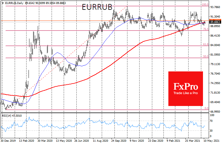 EURRUB консолидируется вокруг 90, психологически важного круглого уровня. Снижаться паре мешает уверенная динамика единой валюты на глобальном рынке с начала месяца. Разрешение этой битвы за 90 может иметь серьезные среднесрочные последствия.