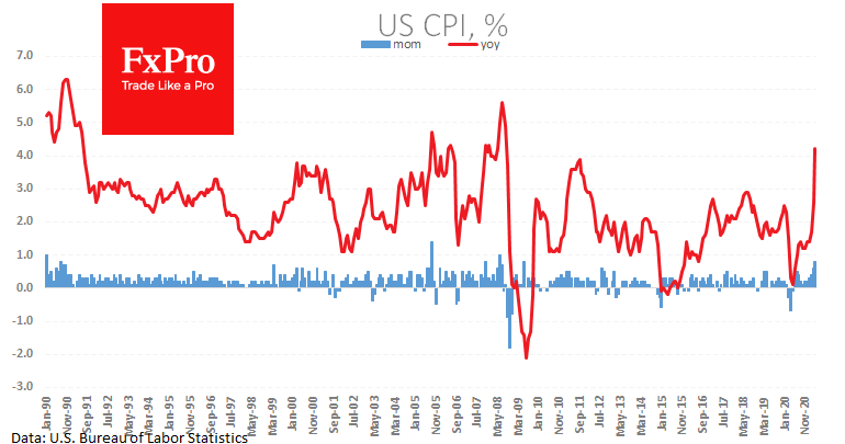 Обеспокоенность инфляцией – это поддержка для доллара. Сигналы от FOMC, что этот отчёт не влияет на монетарную политику, развернёт рынки на 180 градусов, так как инвесторы будут искать страховку от инфляции в покупках сырья и зарубежных валют.