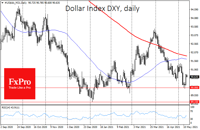 Доллар наслаждался импульсом роста, почти вернув себе обратно потери после слабого отчёта по занятости. Трейдеры вновь закладывали в котировки ожидания скорого ужесточения монетарной политики в ответ на инфляционные данные. Так, рост потребительских цен за апрель составил 0.9% по стержневому показателю, из которого исключены продукты питания и энергия. Это самый резкий скачок с ранних 1980-х, времен бушующей инфляции.