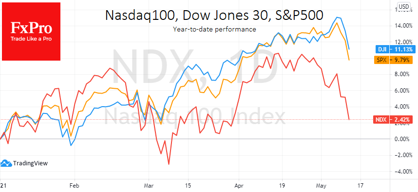 Давление на фондовые рынки вернулось в среду вечером, вызвав 2%-ное падение индекса Dow Jones и 2.7%-ный провал Nasdaq100. Сокращение позиций по рисковым активам вчера стало выходить далеко за пределы ротации из акций технологических компаний – в акции стоимости. Судя по всему, страхи перед инфляцией вызвали бурную переоценку доходностей.