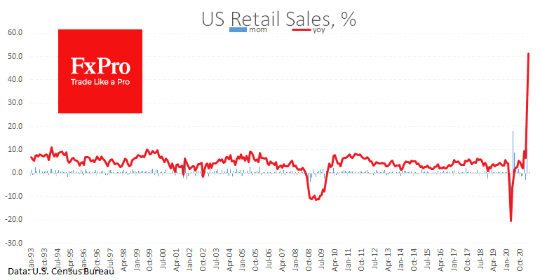 В апреле 2021 розничные продажи были на 51.2% выше, чем ровно год назад, когда был самый жёсткий локдаун в США и продажи рухнули на 14.7%. База по данному показателю будет также экстремально низкой и в следующем месяце, после чего стабилизируется.