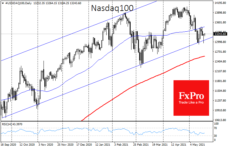 В течение дня индекс Nasdaq рисковал вывалиться вниз из 9-месячного восходящего тренда. Однако, как и неделю назад, получил поддержку покупателей на спаде ниже 13000 и закрыл день в плюсе, отыграв 2% внутридневной спад, прибавляя почти на всём протяжении активной торговой сессии в Нью-Йорке.