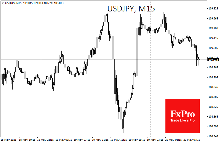 На валютном рынке были не менее значимые метания. USDJPY попала под распродажу в разгар торгов в Европе, рухнув со 109.30 по 108.50, но только чтобы вскоре совершить V-образный разворот к уровням выше 109. Сначала продажи по паре, а затем восстановление покупок стали отражением разворота спроса на риски на мировых рынках.