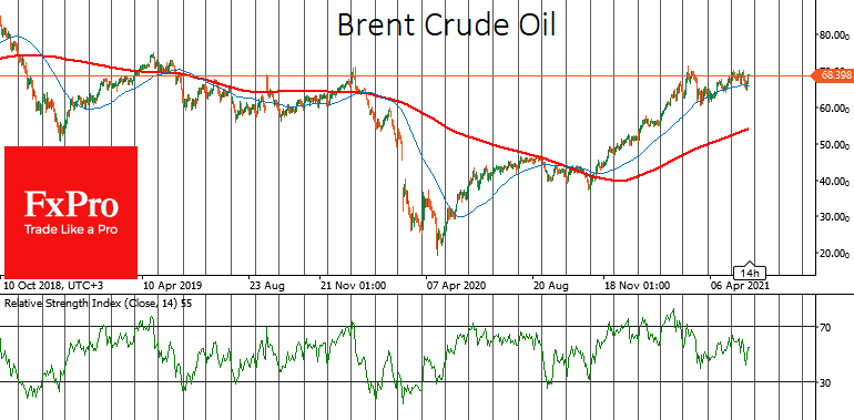 Помимо золота стоит также обратить внимание на нефть: котировки Brent вновь приблизились к $68.50, области максимумов последних двух лет. Шаг выше 70 может сопровождаться капитуляцией медведей, а быки, собравшись с силами после трехмесячной консолидации, способны отправить курс в новый торговый диапазон $70-80.