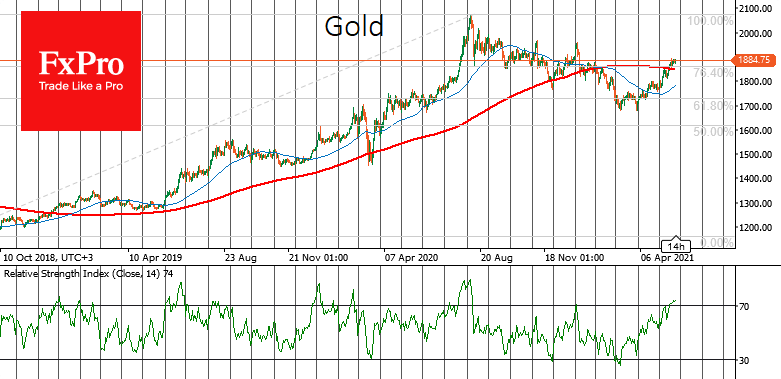 К тому же, золото выглядит краткосрочно перекупленным, забравшись выше 70 по индексу RSI на дневных графиках. В ближайшей перспективе мы вполне можем увидеть консолидацию недалеко от текущих уровней с диапазоном $1844 (200-дневная скользящая средняя) и $1900, важный круглый уровень и область исторических максимумов с 2011 года.