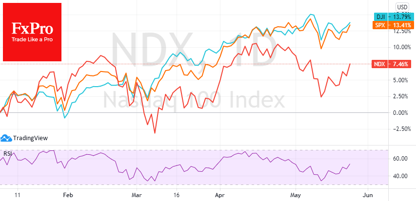 Индекс Nasdaq100 вырос за день на 1.8% против 1% по S&P500 и 0.5% по Dow Jones. При этом, с начала года динамика индексов обратная: Nasdaq100, отстающий в этой троице, прибавил лишь 7.5%, тогда как S&P500 вырос на 13.4%, а Dow Jones - на 13.8%. С точки зрения потенциала роста, высокотехнологические гиганты имеют больше перспектив и выгоды от краткосрочной ребалансировки портфелей.