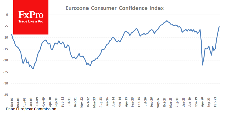 Индекс потребительской уверенности в еврозоне подтвердился на -5.1 в мае. Это самый высокий уровень с конца 2018 года и входит в 20% самых высоких значений за всю историю с 1985 года. На этом фоне неудивительно видеть новые максимумы европейских индексов акций.
