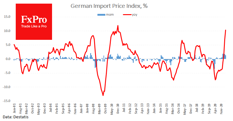 Отдельно от этого Германский Destatis отметил двухзначный темп инфляции в импортных ценах, впервые с 2010. Обращает на себя внимание повышение цен на 6.6% с начала года, что уже выходит за пределы влияния низкой базы.