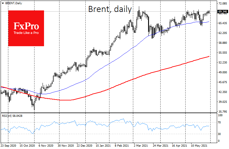 Рынок нефти сохраняет импульс роста, несмотря на явную осторожность игроков в области двухлетних максимумов. Brent торгуется у $69.50, области пиковых уровней 2021.
